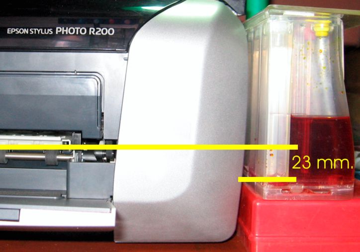 В случае использования обычных бутылочек, без стабилизаторов потока чернил, их необходимо устанавливать так, чтобы уровень чернил в бутылочке постоянно был ниже уровня дюз (фактически - уровень выхода бумаги из принтера) примерно на 1-2 см. Это создаст необходимое разрежение в системе. Необходимо помнить, что в случае использования простых бутылочек, этот уровень нужно поддерживать постоянно.